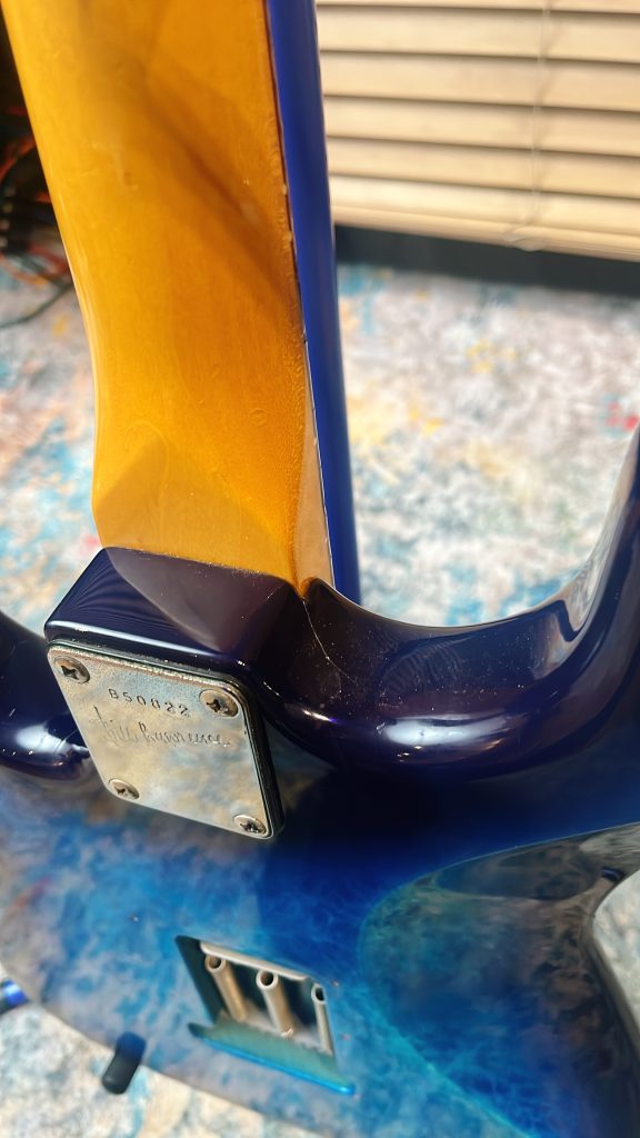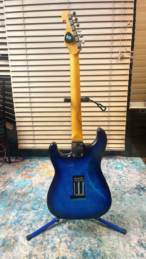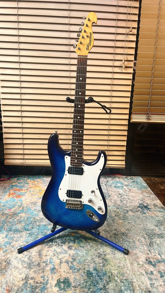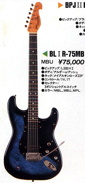 ビルローレンスっていうメーカーのBL1 というギターでございます。当時定価で75,000円。1985年8月生まれの純国産ギターです。モリダイラってとこが作ってます。この時期の国産ギターってめちゃくちゃ気合い入れて作ってて、とにかく安くて出来のいいギターが多いんだけども、このギターもそういう良き時代の産物の代表的な一本なんだよね。
