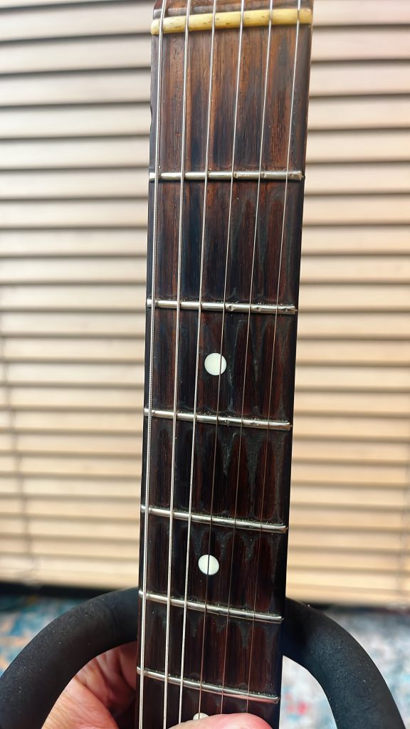 その後にどうにも調子が悪くて、リペアにお願いしたら「全部フレットがちょっとずつ浮いてるけど、どうしたの??」と聞かれました。