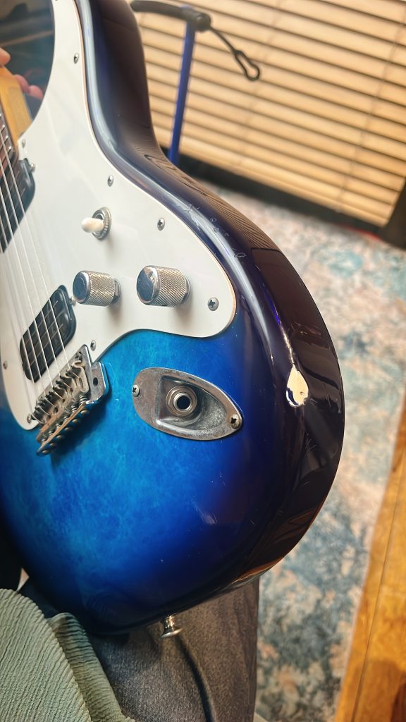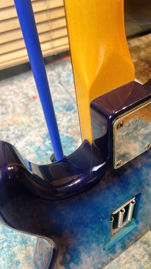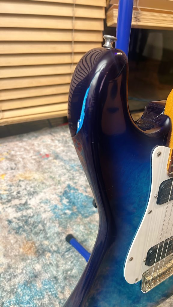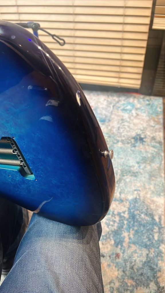 そしてこのギター、よく見ると打痕、塗装割れが凄まじいのです。ご覧くださいませ、この満身創痍っぷり。一体何があった??ってレベルです。
