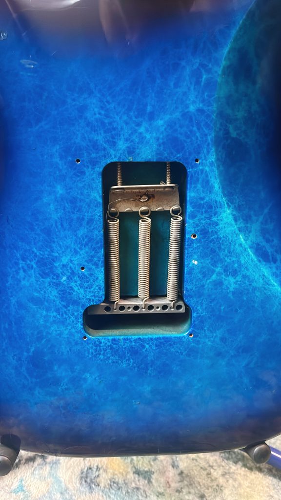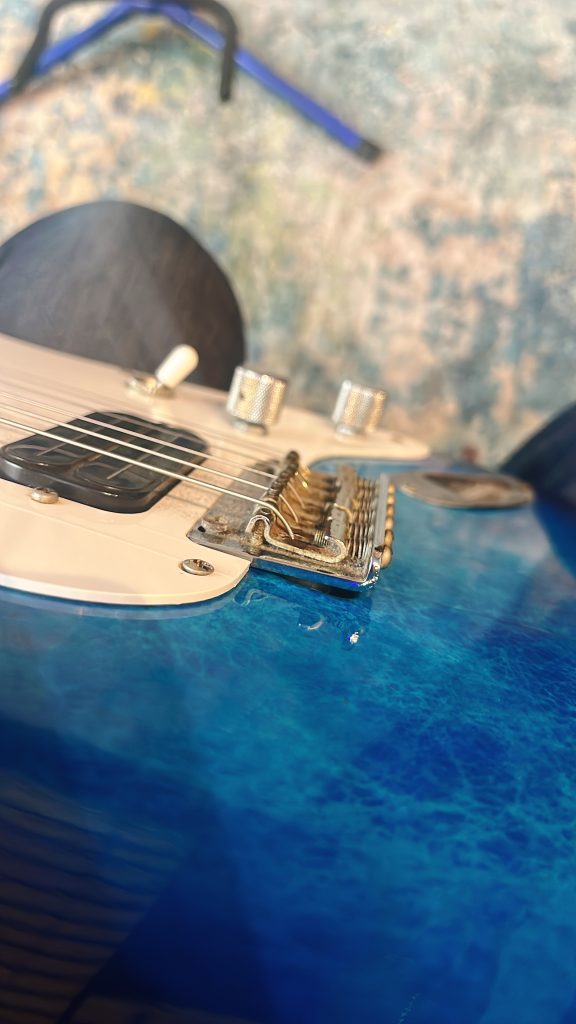 ピックアップは先述のL500が搭載されています。通常ピックアップのポールピースって円柱なんだけど、このピックアップはブレード型。サウンドも特徴的だけど、見た目も結構個性的よね。かっこよい。ワンボリューム、ワントーン、スリーウェイスイッチ、舟形ジャックと、このへんはいわゆるストラトタイプですかね。ボディはフィルムだけど、大理石の様なマーブル模様がとてつもなく特徴的。動画で見てくれている人はこの模様=瀧澤克成みたいなイメージがあったりするんじゃないかしら。